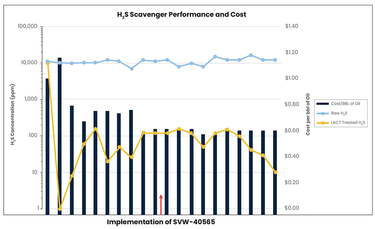 After changing over the chemical in early 2025, SVW-40565 was continuously injected with producedoil downstream of the heater treater oil dump at a comparable injection rate to the previous amine scavenger dosing rates. However, due to the lower cost of the formulation on a per-gallon basis, the operator realized an immediate 20-30% reduction in chemical spend per barrel of oil treated.